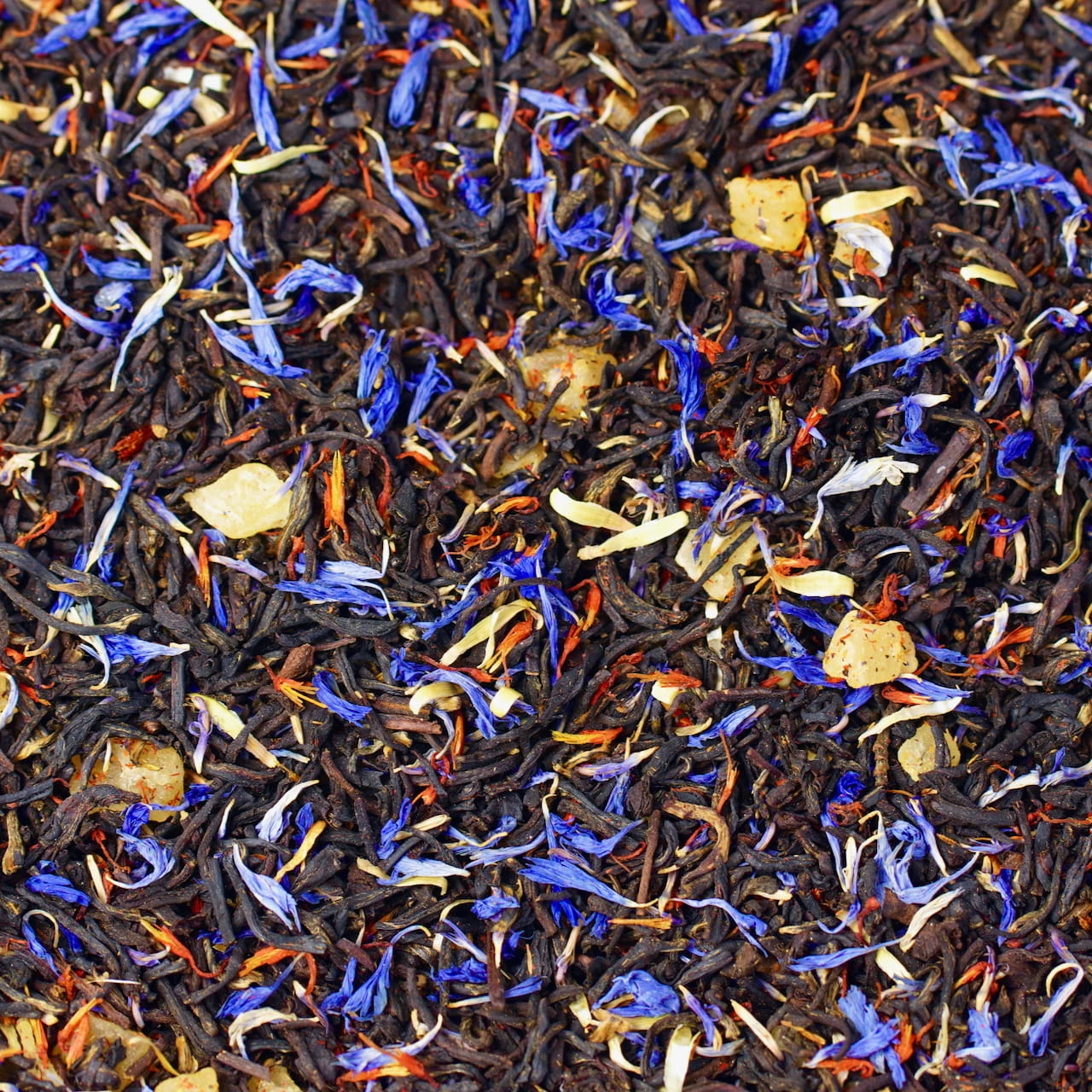 Skład: czarna herbata liściasta, kostki kandyzowanego ananasa, płatki krokosza i słonecznika, aromaty