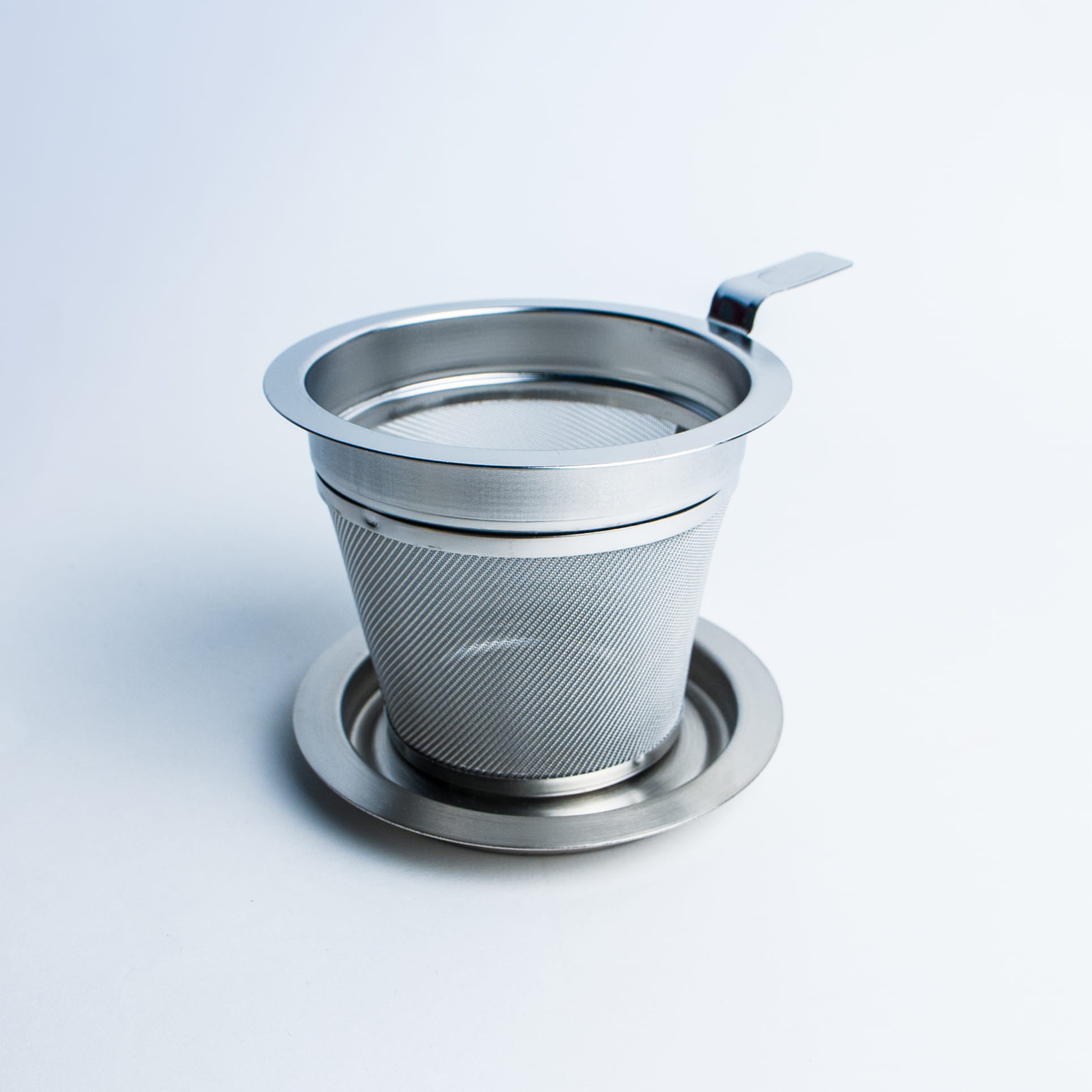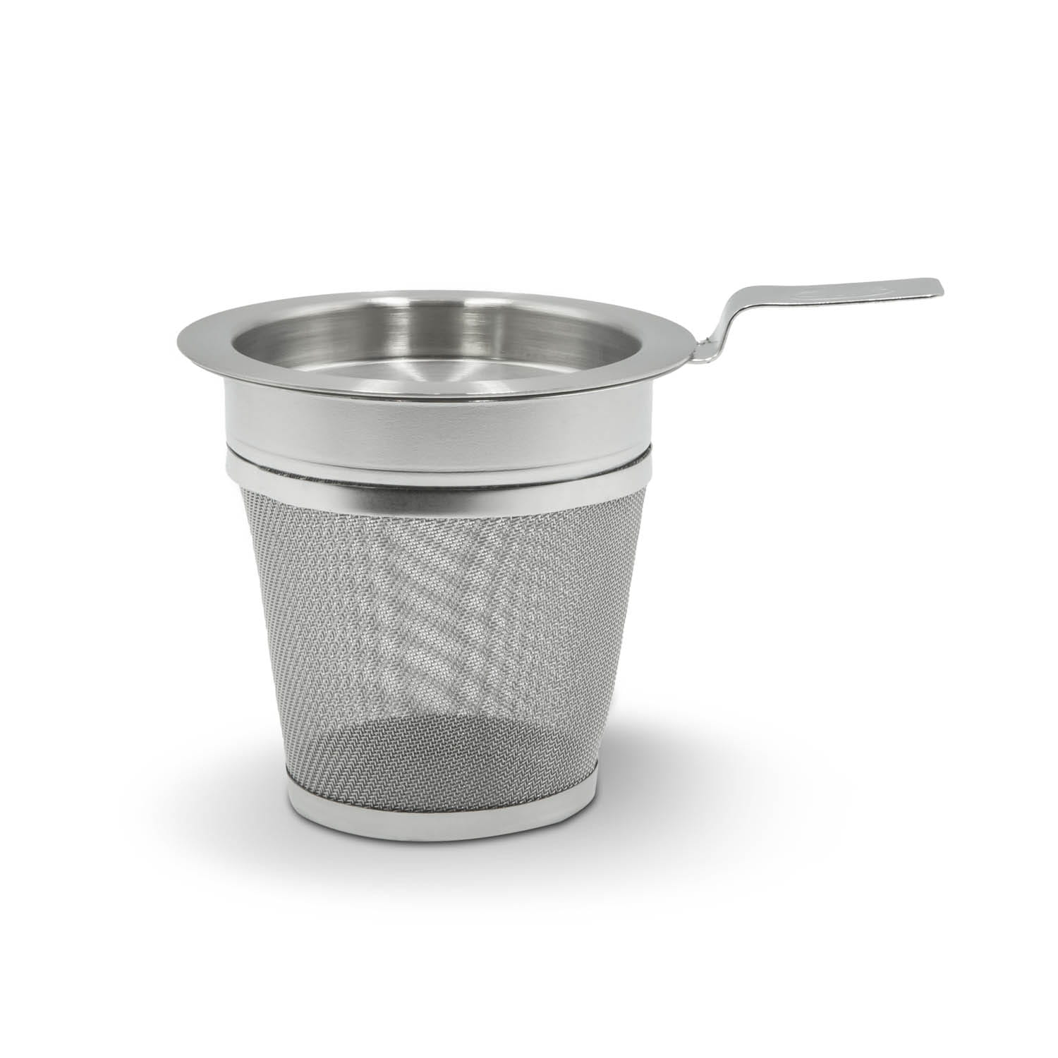 Filtr do herbaty wykonany ze stali nierdzewnej. W komplecie z podstawką.