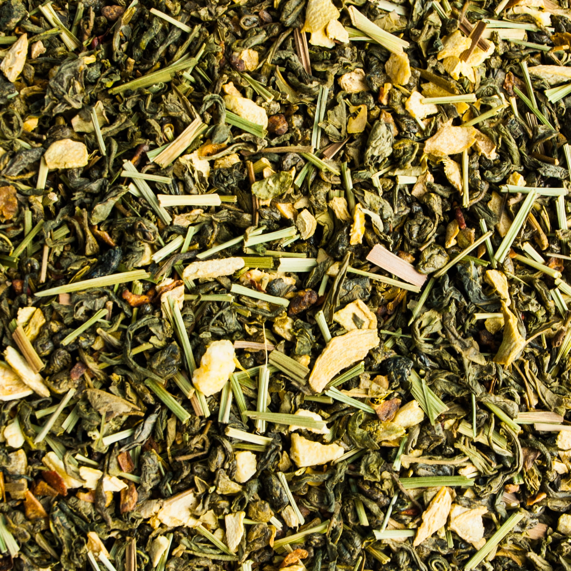 Składniki: zielona herbata liściasta, cząstki imbiru, kawałki jabłek, trawa cytrynowa, aromaty, granulki cytrynowe, kwas cytrynowy