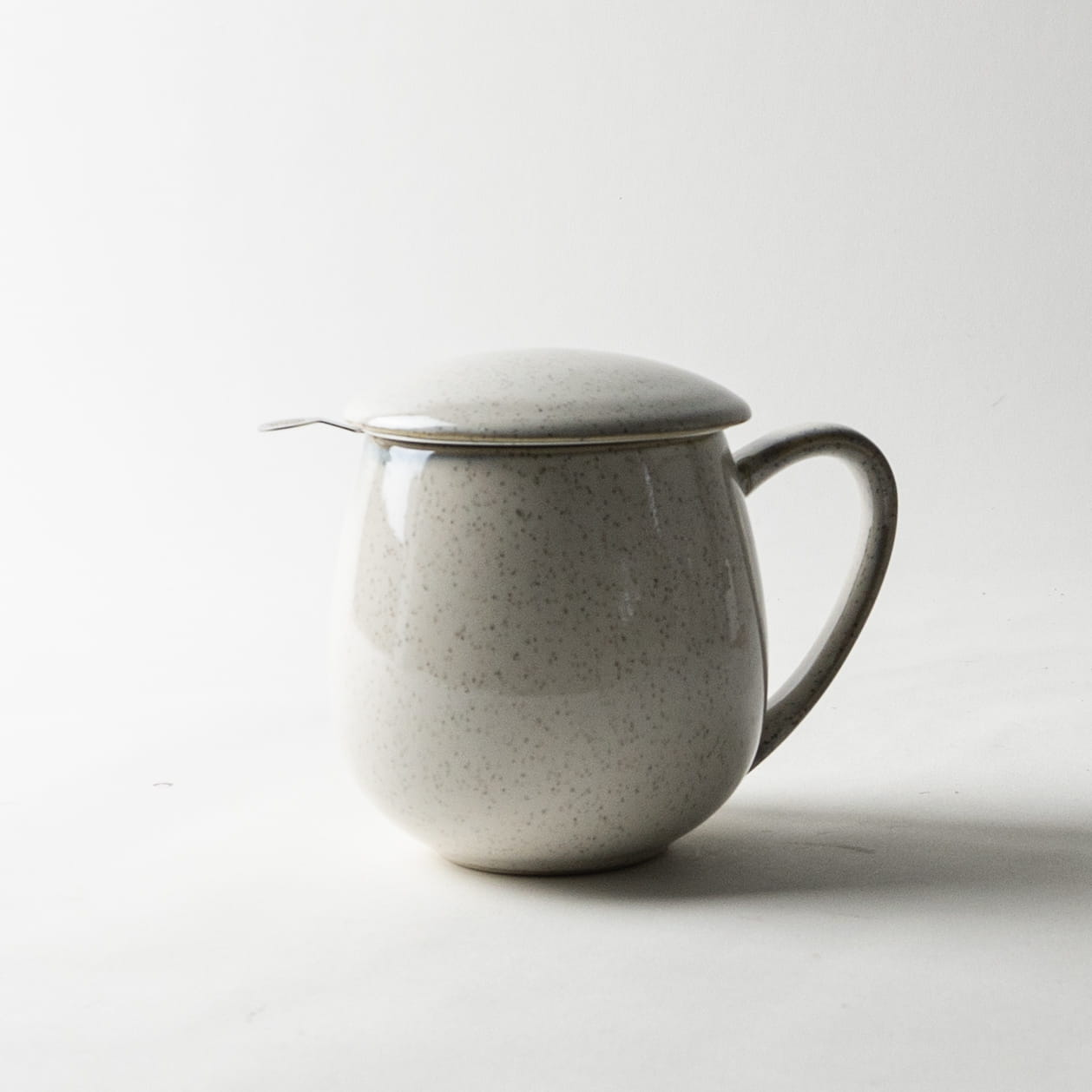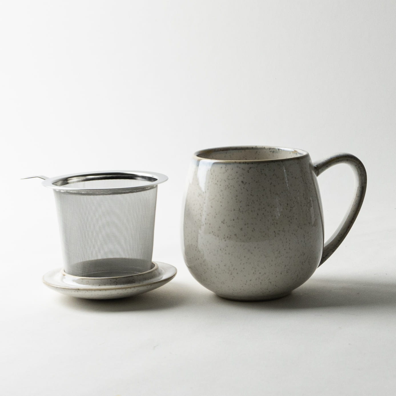 Kamionkowy kubek z reaktywną glazurą i metalowym zaparzaczem. Pojemność: 0,35l.