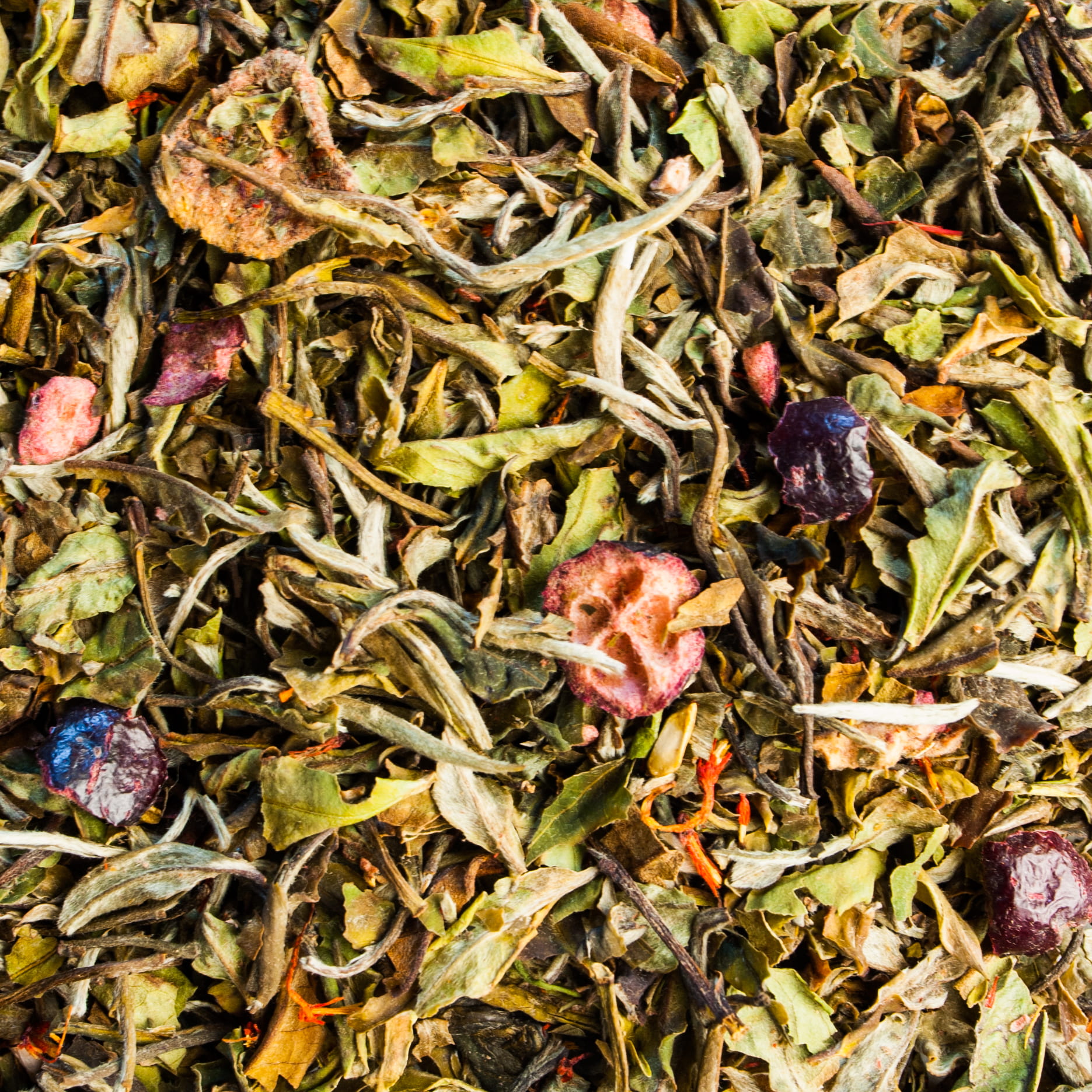 Składniki: herbata biała liściasta, owoc żurawiny, aromaty, kawałki truskawek, krokosz, pestki granatu