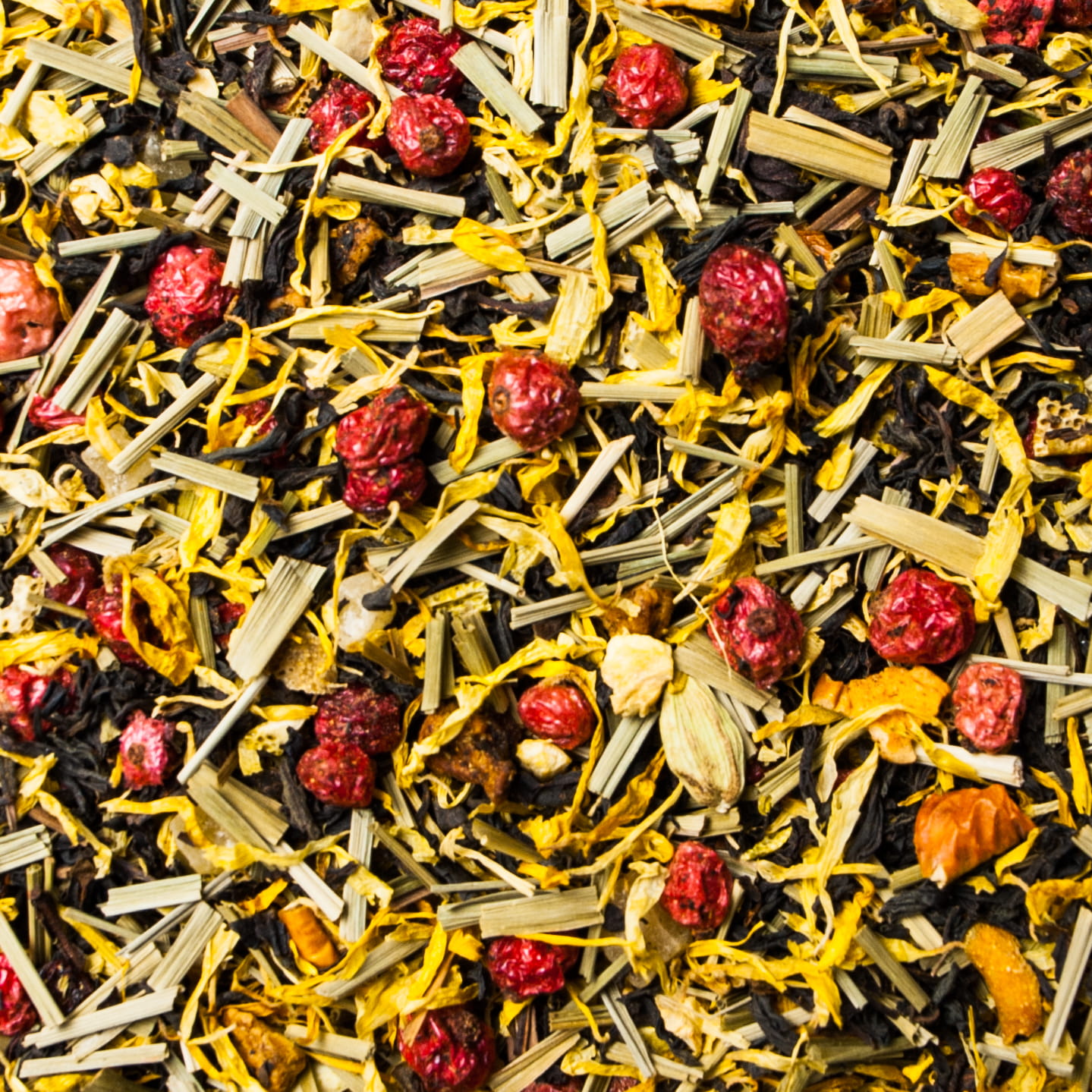 Skład: czarna herbata (70,5%), trawa cytrynowa, skórka pomarańczy, kandyzowane cząstki ananasa, aromaty, czerwona porzeczka, kawałki jabłek, cząstki imbiru, kardamon, płatki słonecznika