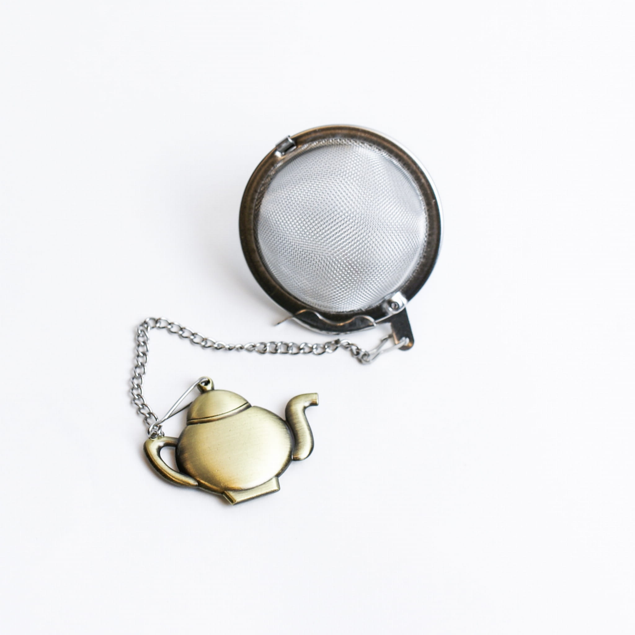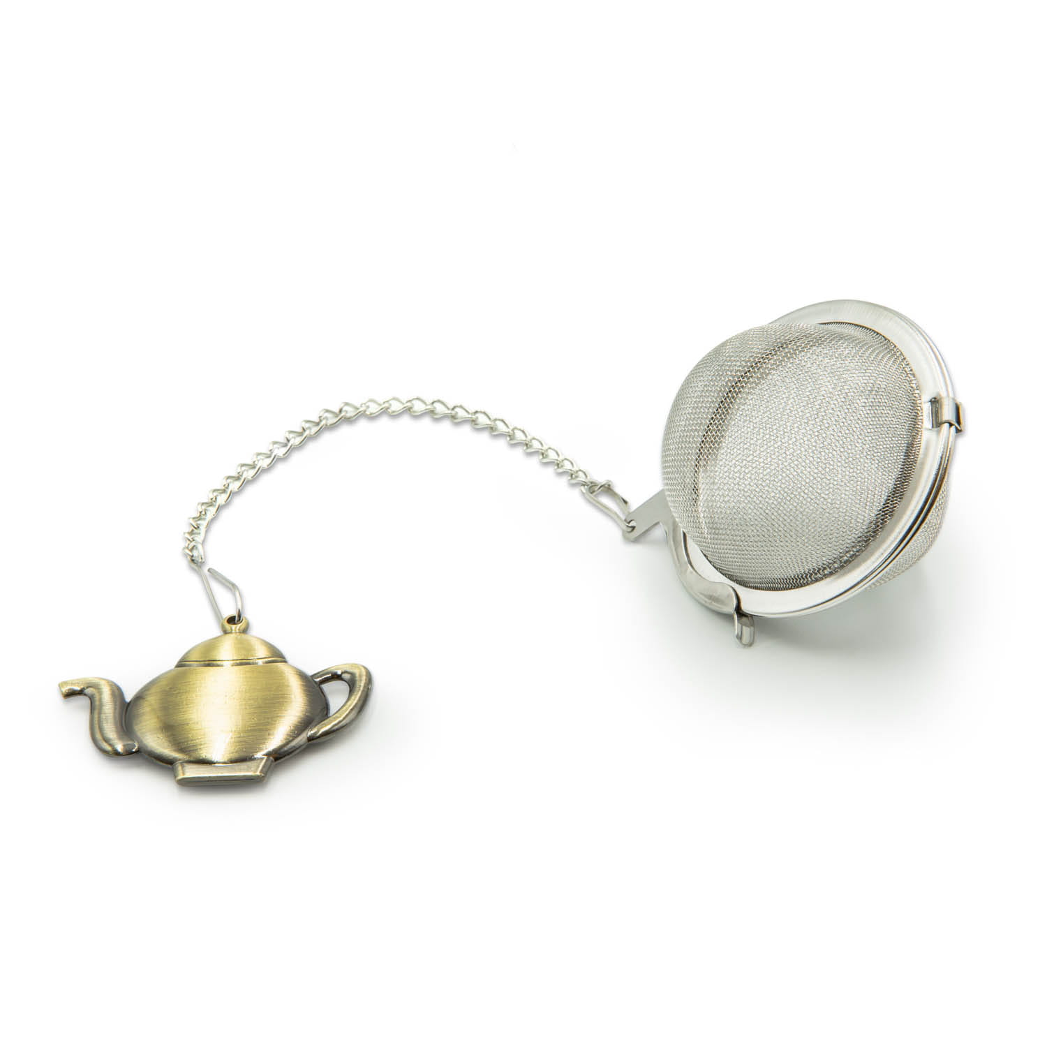 Zaparzacz ze stali nierdzewnej do herbaty w kształcie kuli z łańcuszkiem zakończony przywieszką.